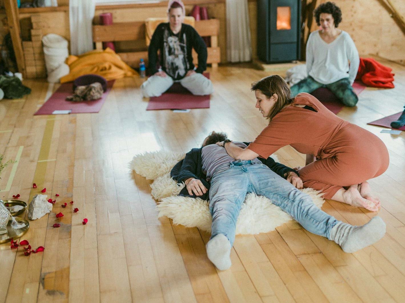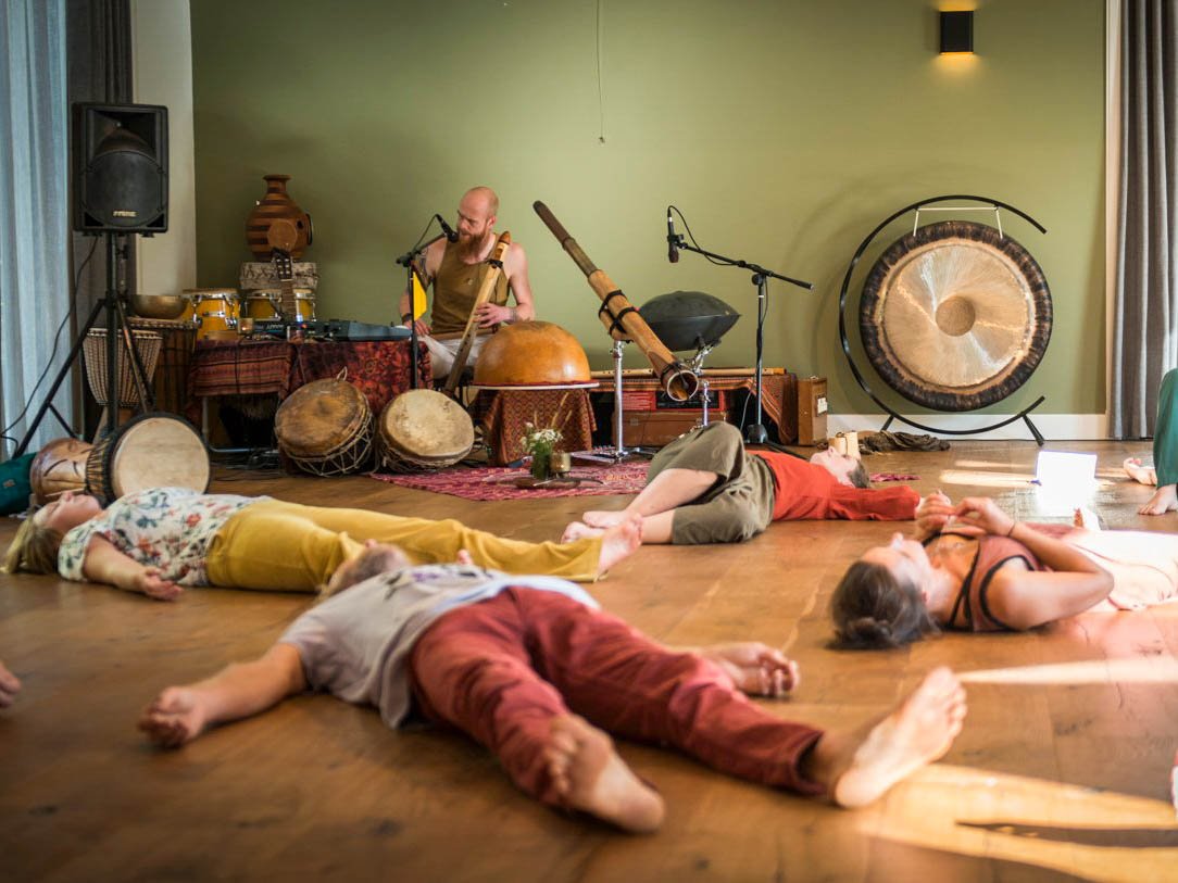 Je ligt op een matje, opent je mond en ademt actief in en uit via je buik, zonder pauzes. Door samen te ademen ontstaat er een diepe verbinding in de groep.